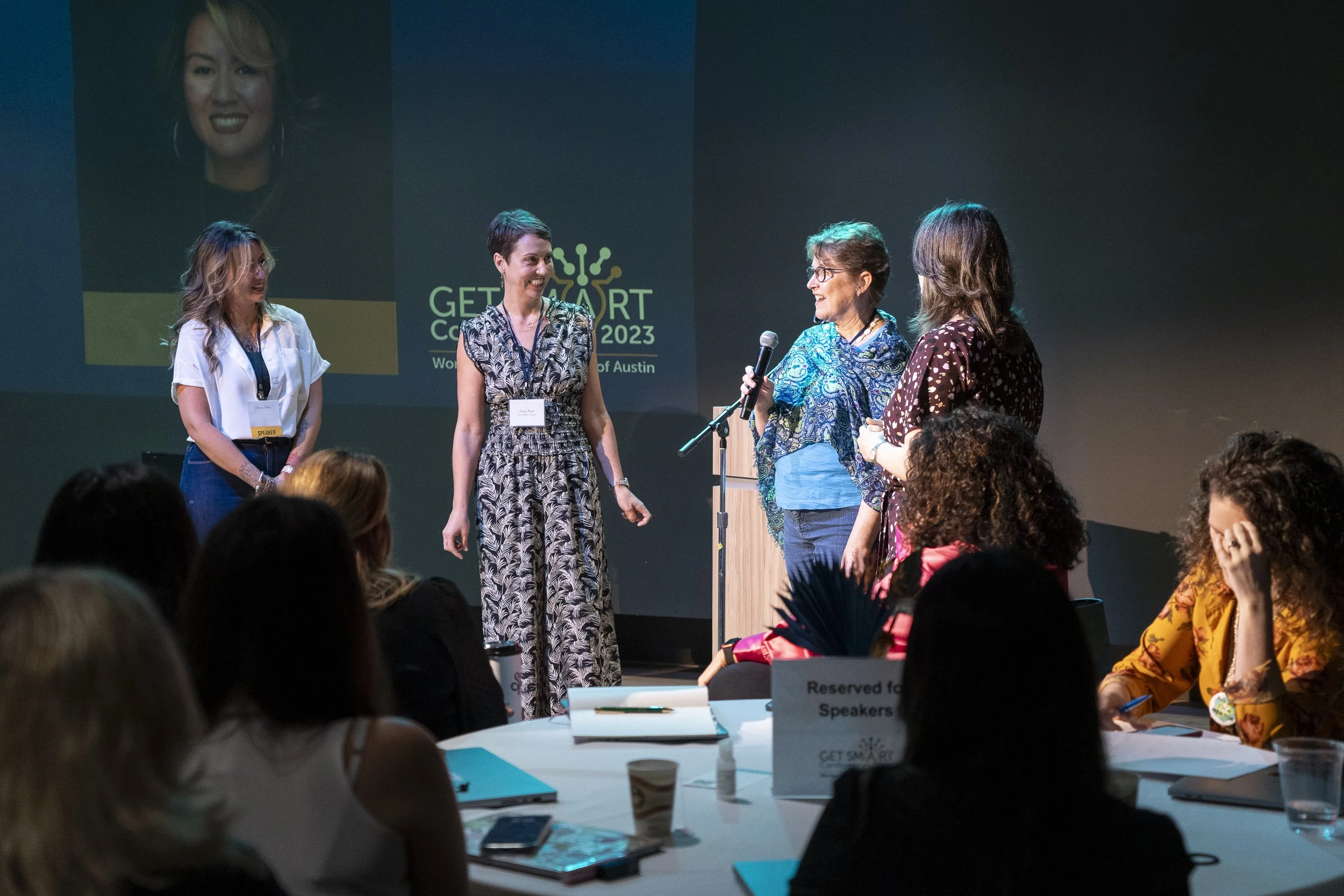 Women speaking on stage at a conference, with an audience seated in front. The backdrop displays the name Clarena Tobon and conference branding.